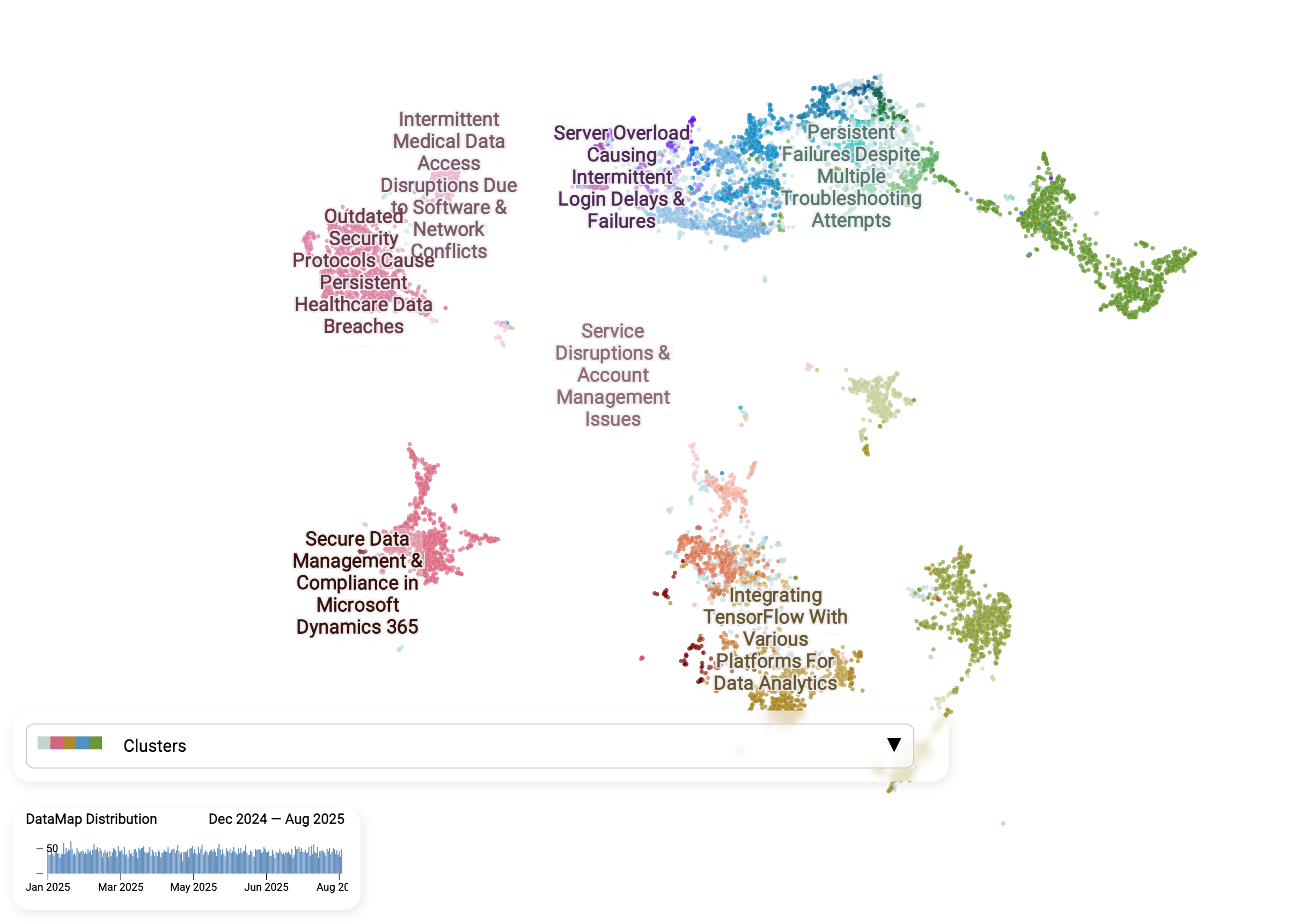 - Clusters emerge naturally. Unlike static ticket categories ("Technical Support," "Product Support"), these groups are not predefined. They form based on the actual language customers use, so patterns surface that might otherwise stay hidden. You can see how tickets group into distinct islands, such as "Server overload causing login delays", "Persistent failures despite troubleshooting", or "Secure data management in Microsoft Dynamics 365." These are issues that would be buried under static, catch-all categories in a traditional system.