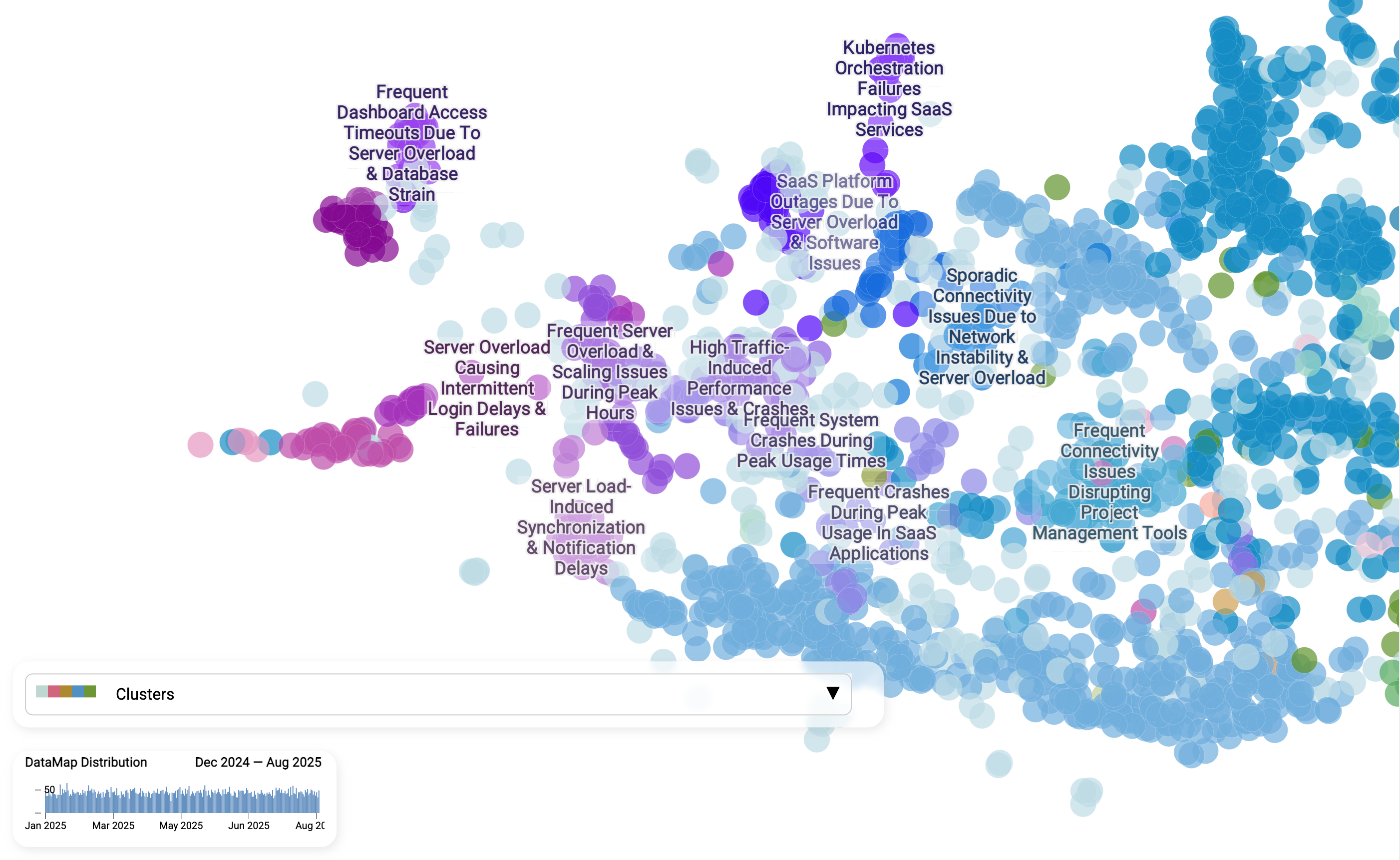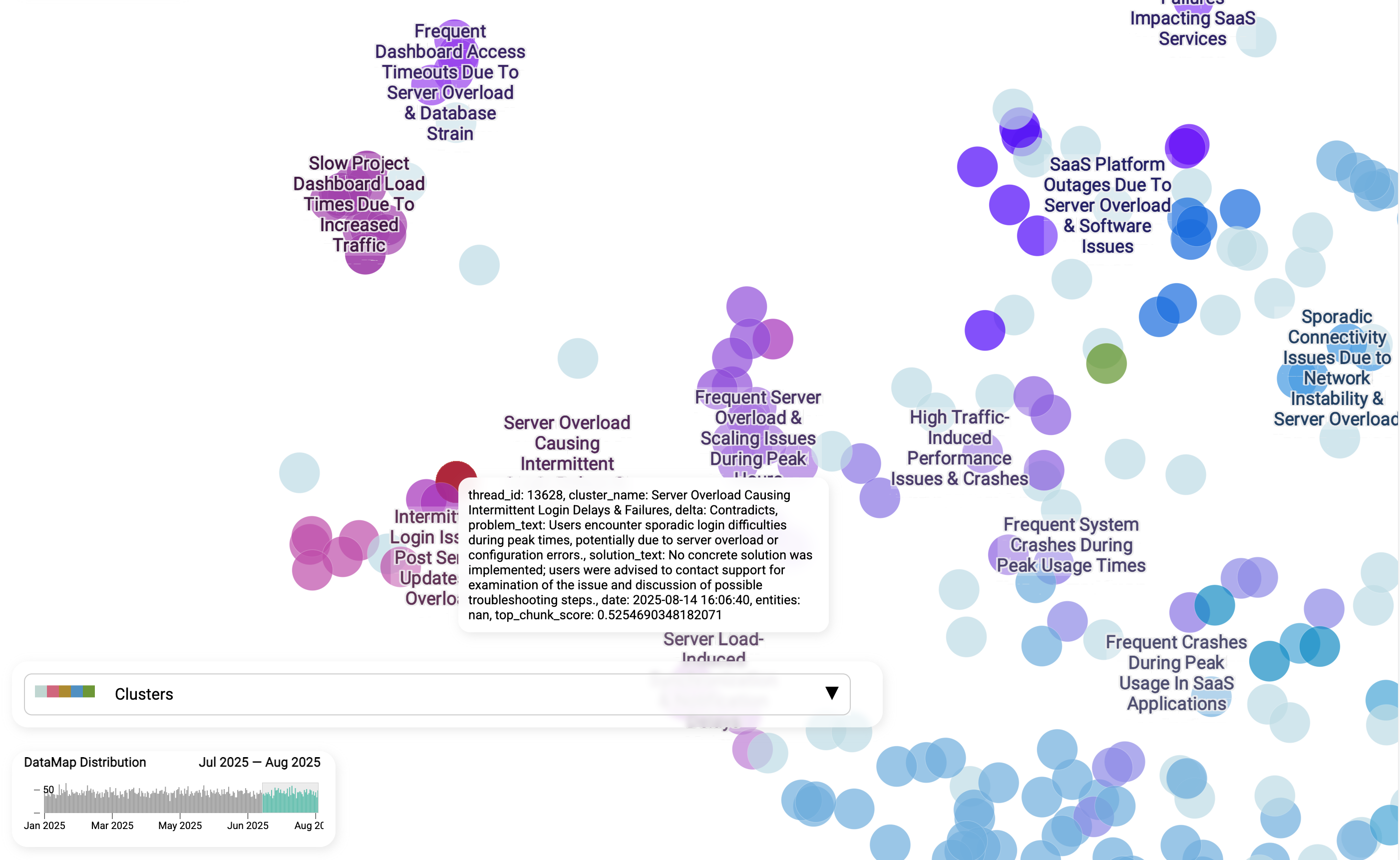 Here we zoom into one specific cluster: "Server overload → intermittent login failures." Each dot is still a single ticket. Customers describe login issues in different ways, but the AI recognizes the shared meaning. Sub-clusters reveal nuance. Within the broader theme, the model detects finer shades of the problem: