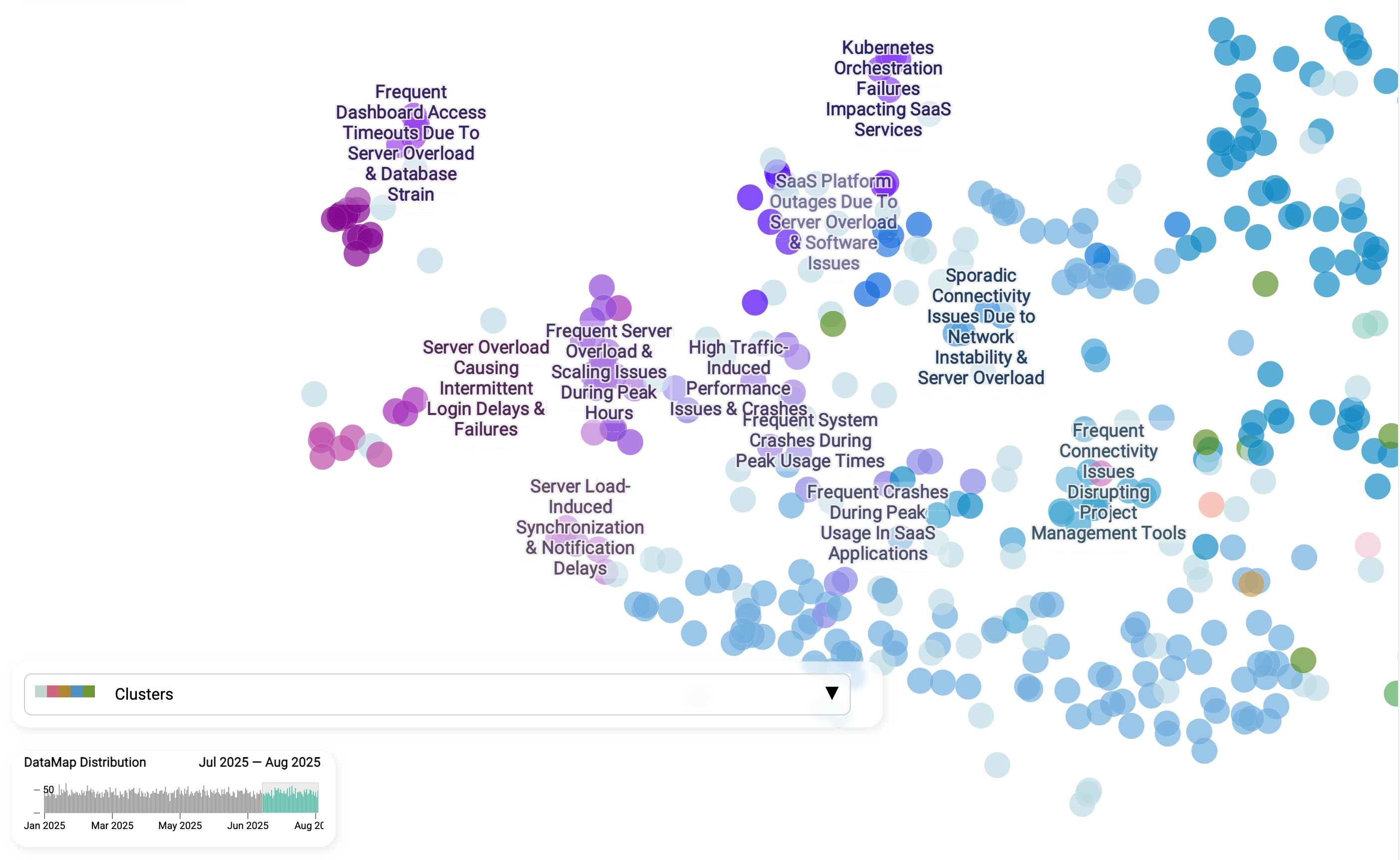 Having a data map that would be aggregating real time cases would reveal this information in seconds. When we compare the Login failures cluster from Jan - Apr with Jul - Aug 2025, the story becomes clear: this is not a one-off glitch but a persistent, unresolved issue. The same sub-themes - server overload, peak-hour scaling problems, and synchronization delays - show up consistently across both timeframes. This kind of view is powerful because it separates chronic pain points from new incidents. Instead of guessing whether a spike in support tickets is tied to a recent release or represents a long-standing weakness, teams can see patterns over time, assign accountability, and invest in structural fixes rather than endless firefighting.