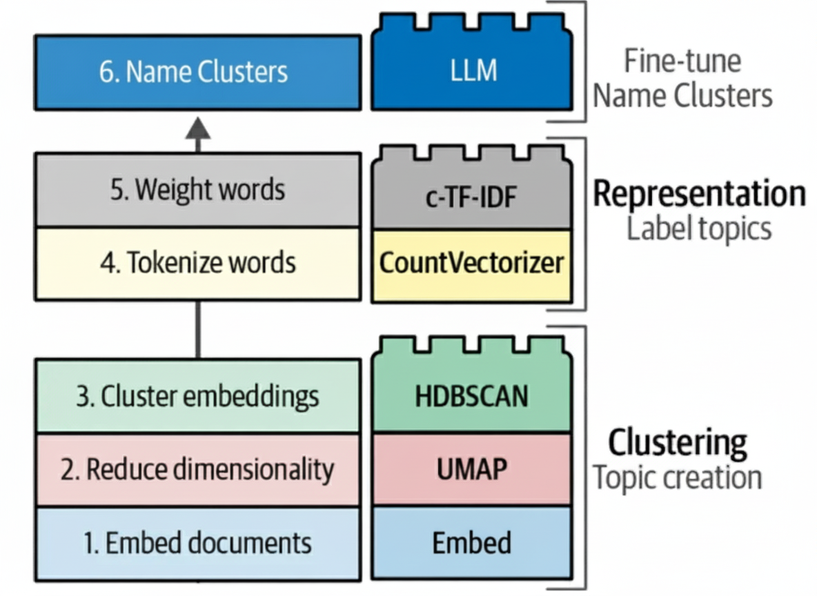 Each problem is turned into a numeric "meaning vector" (an embedding). Similar tickets sit near each other, so we can build clusters from broad themes down to specific sub‑issues. To achieve this we use Semantic Embeddings & Similarity Search, Hierarchical Clustering, Topic Modeling & Labeling.