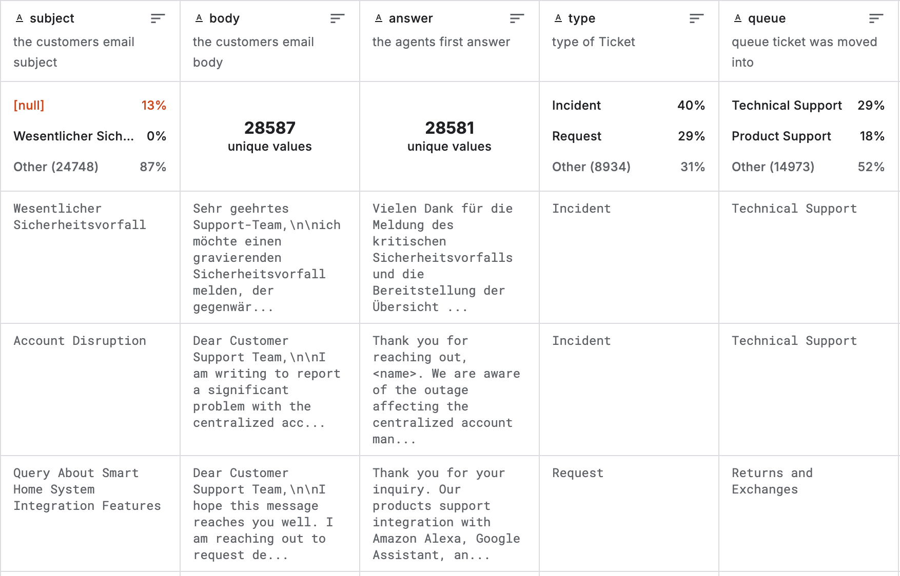 Let's explore a practical example leveraging a Customer IT Support - Ticket Dataset. The dataset contains around 30,000 real customer support exchanges, where each record captures an email from a customer along with the company's first reply.