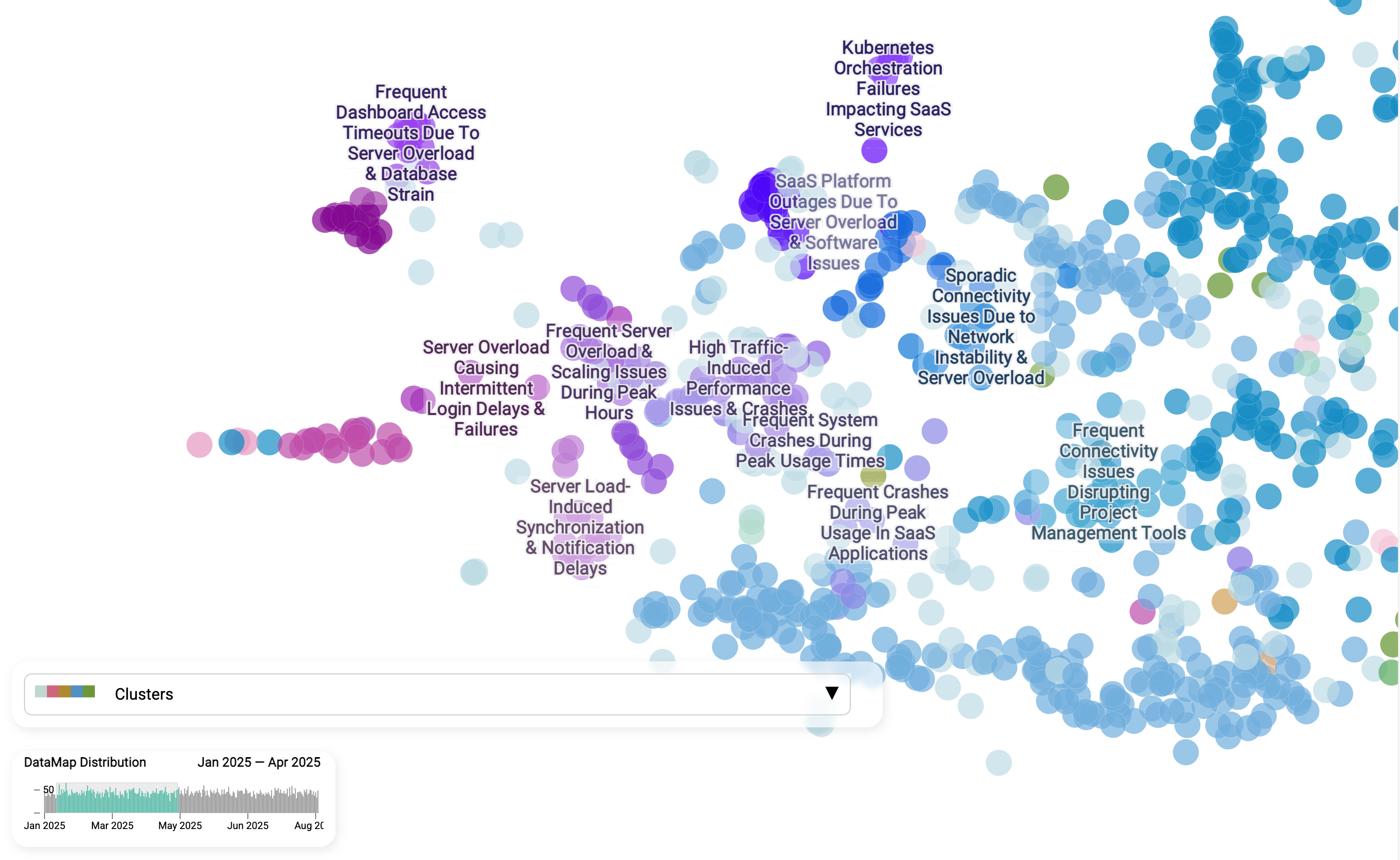 Having a data map that would be aggregating real time cases would reveal this information in seconds. When we compare the Login failures cluster from Jan - Apr with Jul - Aug 2025, the story becomes clear: this is not a one-off glitch but a persistent, unresolved issue. The same sub-themes - server overload, peak-hour scaling problems, and synchronization delays - show up consistently across both timeframes. This kind of view is powerful because it separates chronic pain points from new incidents. Instead of guessing whether a spike in support tickets is tied to a recent release or represents a long-standing weakness, teams can see patterns over time, assign accountability, and invest in structural fixes rather than endless firefighting.